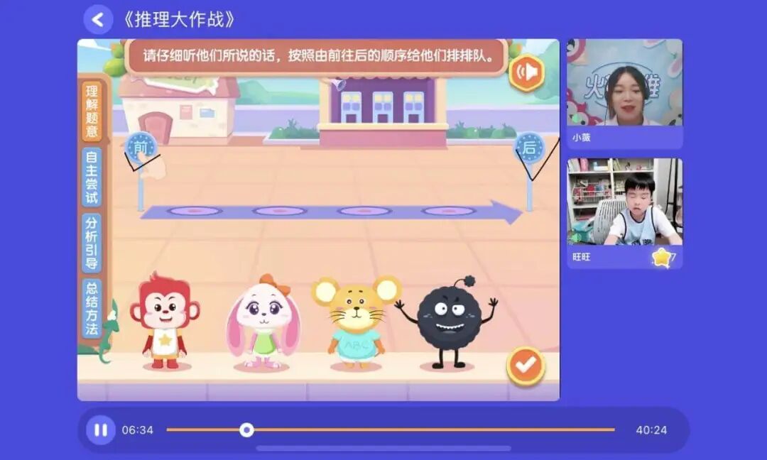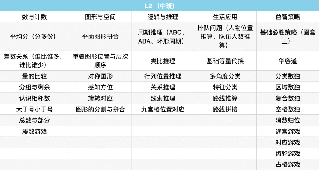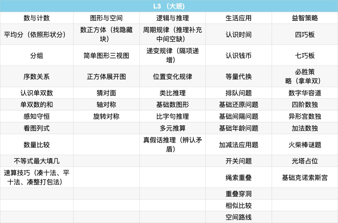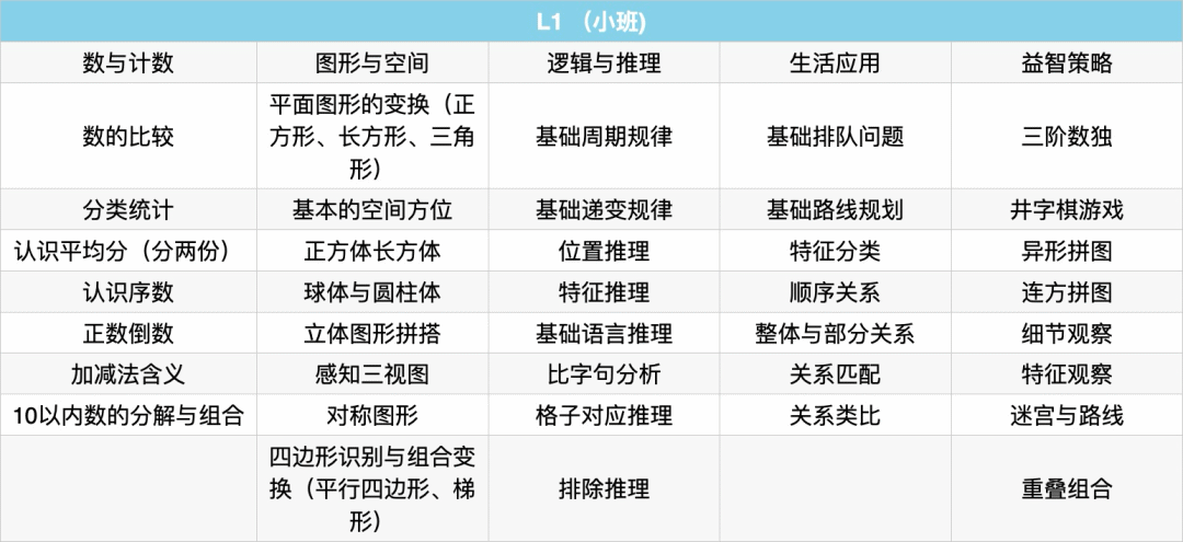 而在思维训练上,代换和替换思维、思维导图训练、列表法、复杂的真假话推理、排除法运用、分步思维、转为思维,将是这阶段的培训重点。此外,老师也会引导孩子通过观察、比较、分析、综合,发现事物之间存在的某种规律或规则,并应用规律解决问题。
