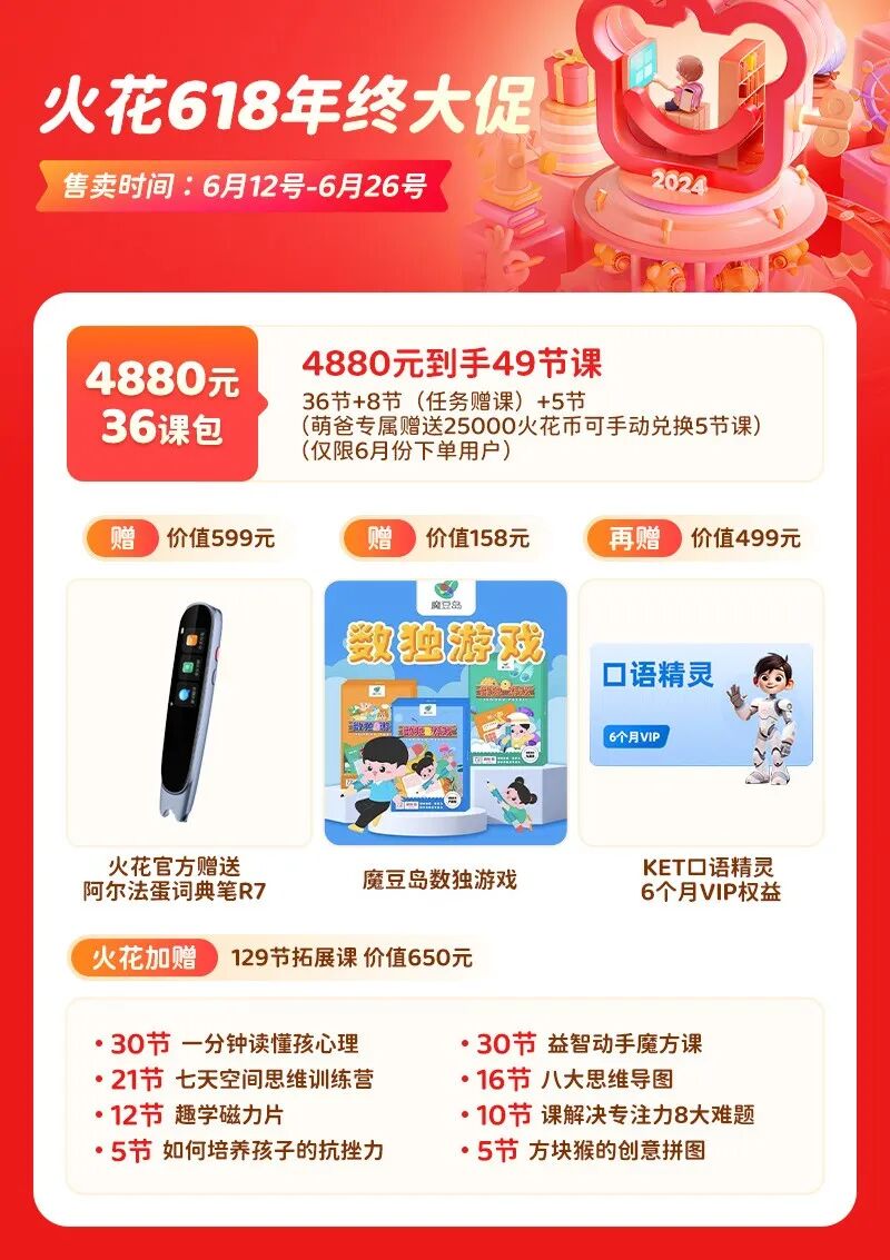 A 不管是 36 课时包、还是 48 课时包,本次开团,只要购买正课,都立即赠送两个超给力的实物赠品——价值 599 元的阿尔法蛋词典笔 R7、和价值 158 元的魔豆岛数独游戏(均在下单正课的次月 25 号发货)。
