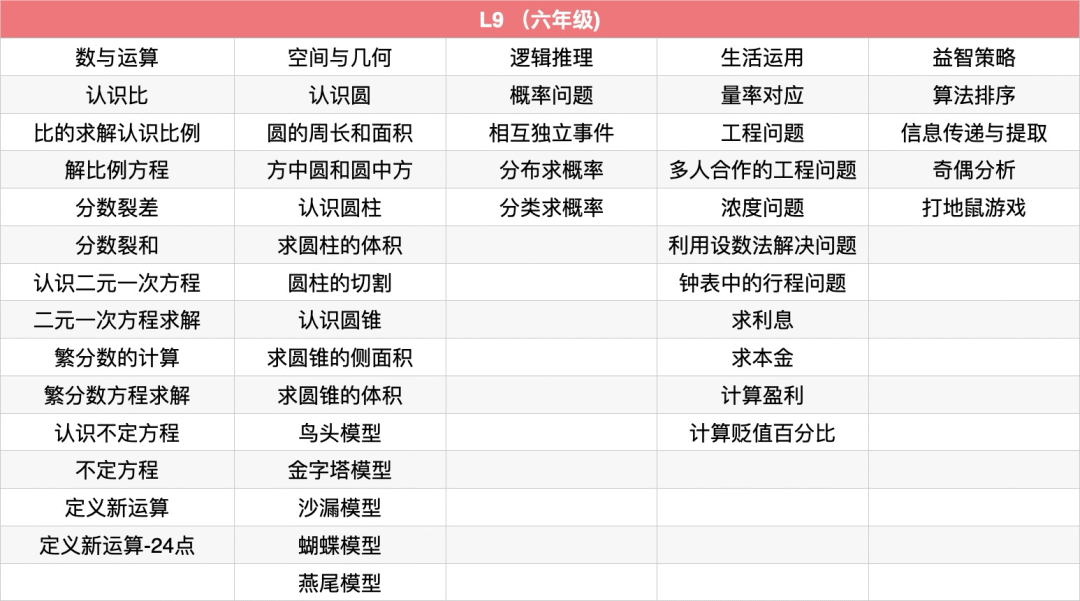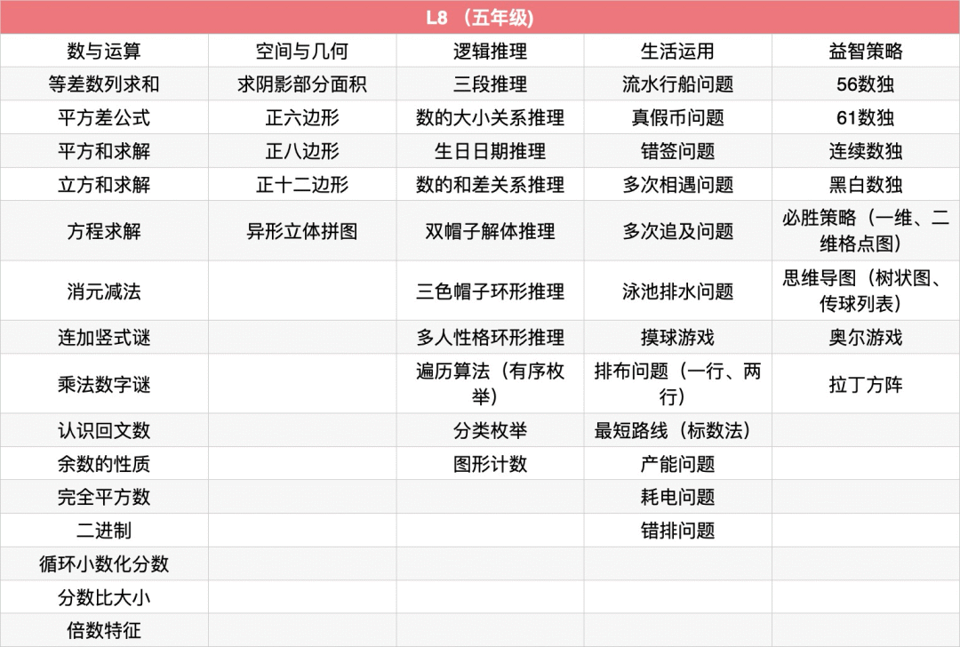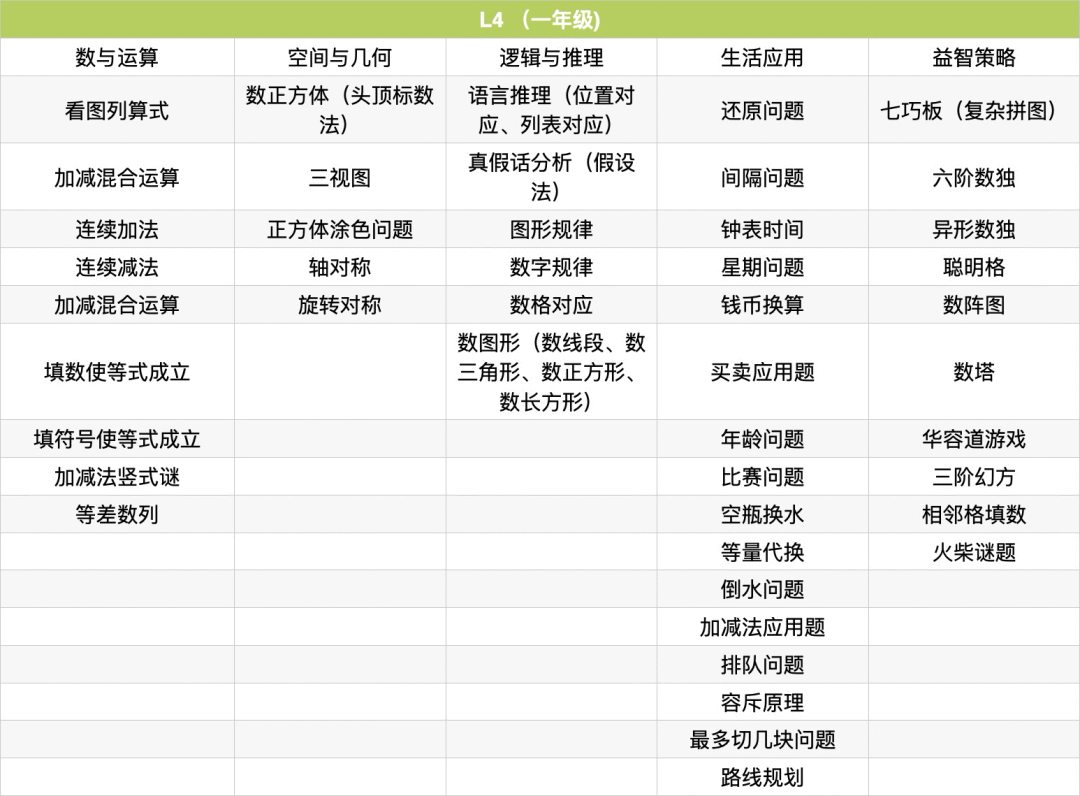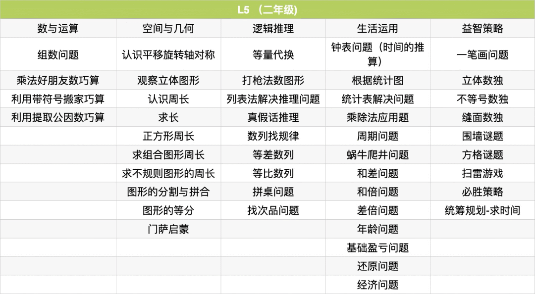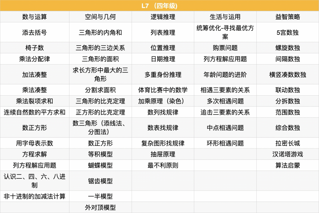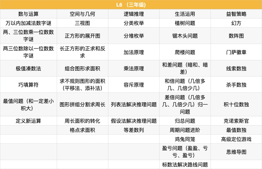 例题:植树问题、锯木头问题、爬楼问题、暗和与暗差、归一问题、归总问题、周期问题进阶、鸡兔同笼、盈亏问题(盈盈、亏亏、盈亏)、标数法解决路线问题、幻方、数阵图、门萨徽章、线索数独、高级定位游戏、思维导图