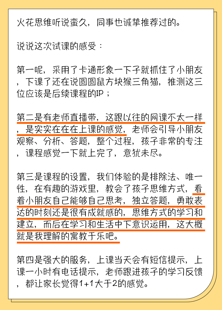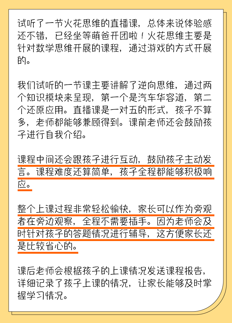 就如我标题所说,粗浅的去看,火花思维和所有的学科都不直接相关;但是,它涉及到的几乎每一个知识点、每一种思维方式,你也都能直观的感受到——嗯,这个方式 / 技巧 / 知识点好有用,孩子未来一定会用到!