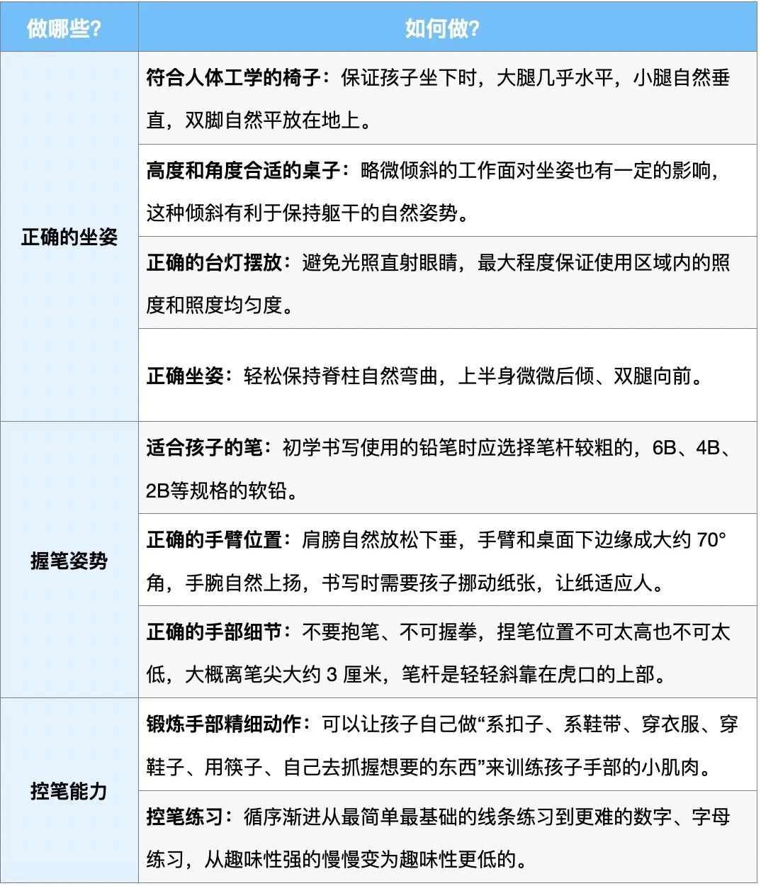 不过,控笔看似简单,实际上包含3大部分——正确的坐姿、握笔姿势以及控笔能力,都是孩子能写好字的重要基础,下面萌医生简单给大家列一个操作大纲👇