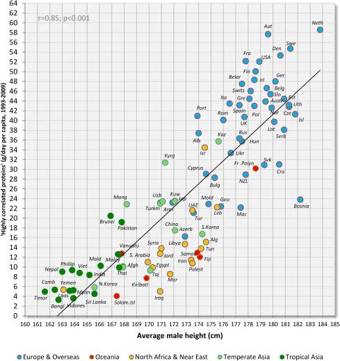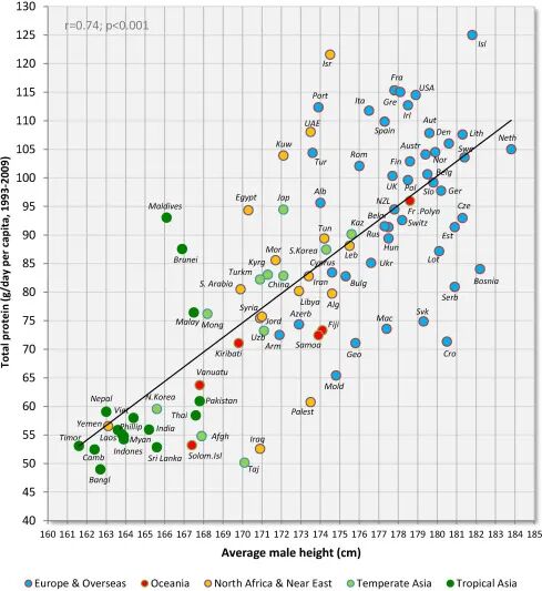 也就是说,首先,蛋白质摄入充足很重要,而在摄入充足蛋白质的基础上,蛋白质质量更为重要,这也可以解释,东亚高度发达国家男性身高普遍不高,是与他们摄入的蛋白质质量较低有关。