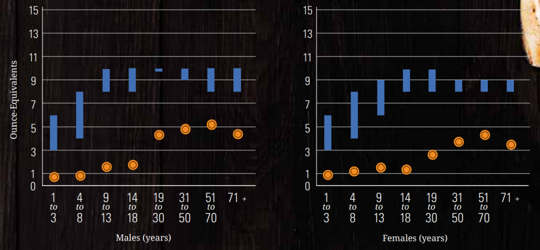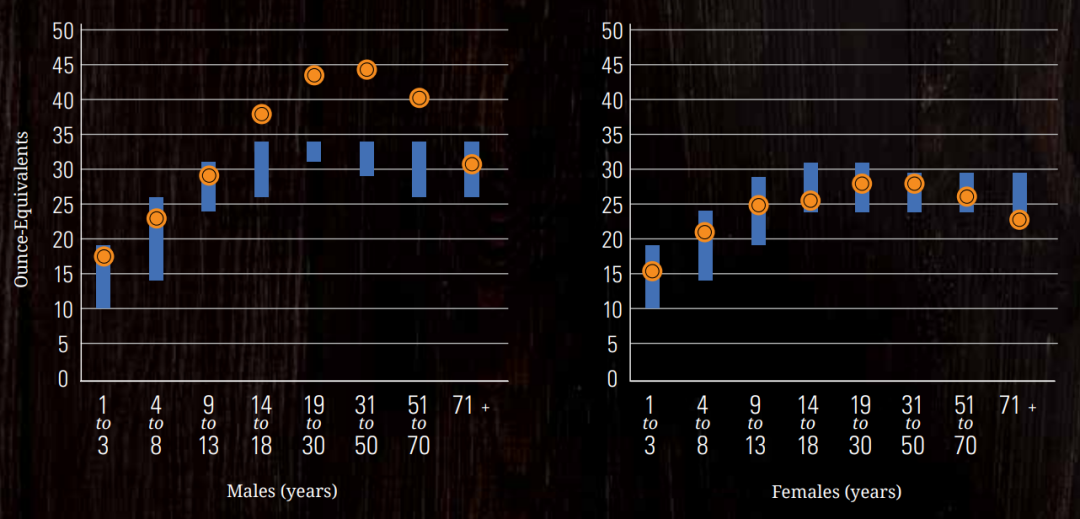 △肉类、家禽和蛋类:按年龄性别组划分的每周蛋白质平均摄入量(橙色)与推荐摄入量范围(蓝色)