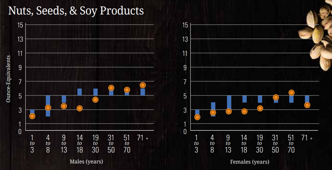 △坚果、种子和豆制品:按年龄性别组划分的每周蛋白质平均摄入量(橙色)与推荐摄入量范围(蓝色)