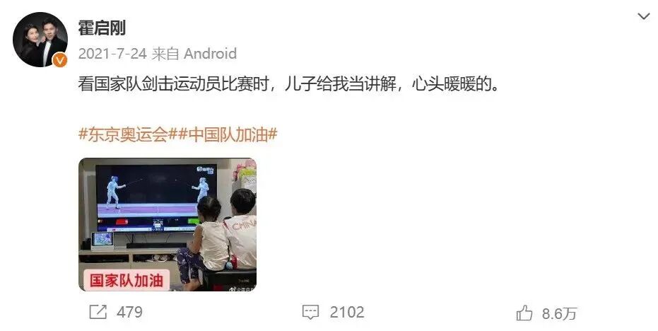 不过呢,奥运期间,霍启刚也认真在家带娃观赛了,不过看的并不是妈妈担任裁判的跳水比赛,而是击剑比赛,这让很多人都有些意外,不仅如此,当时才7岁的儿子霍中曦还能给爸爸当解说员👇