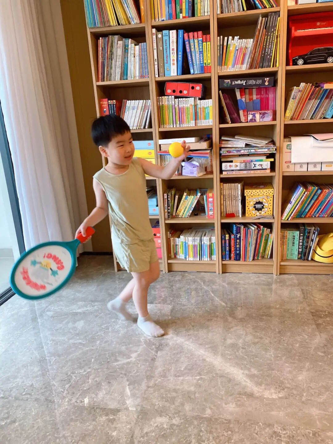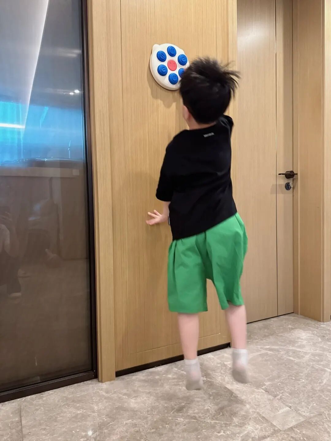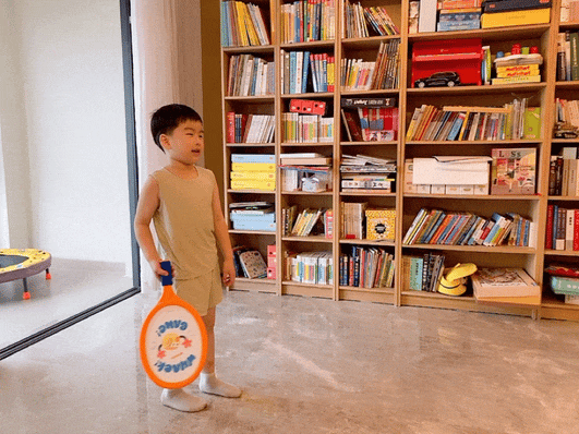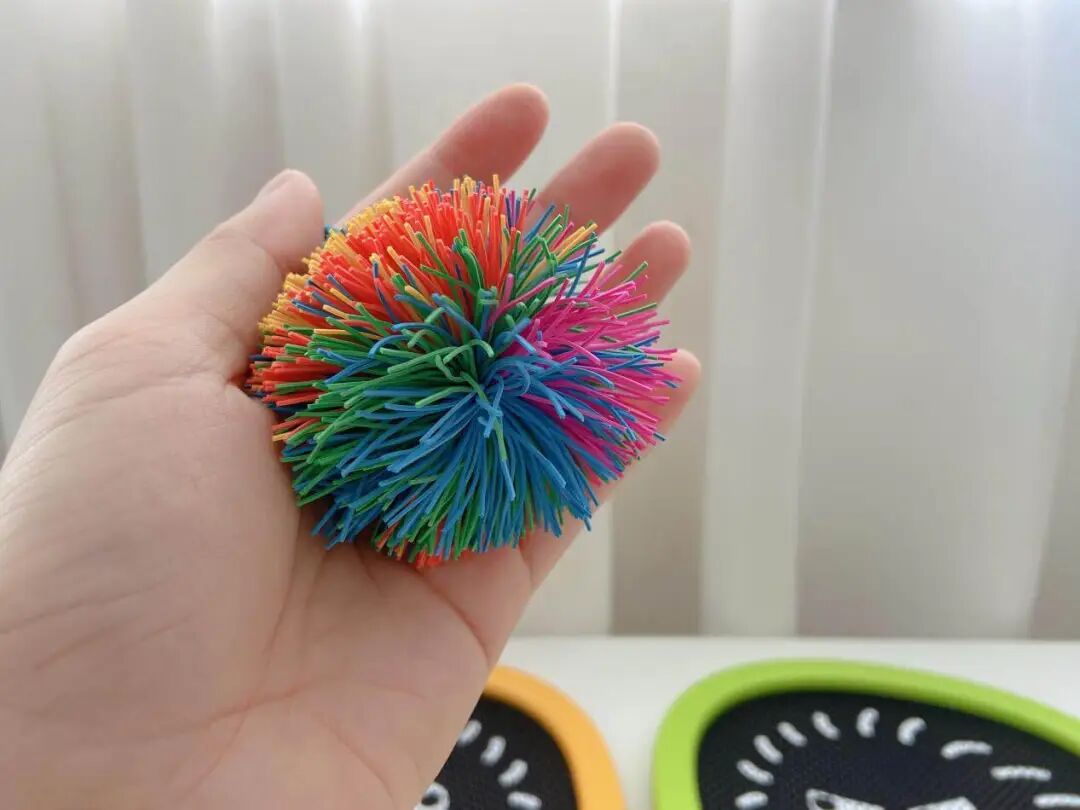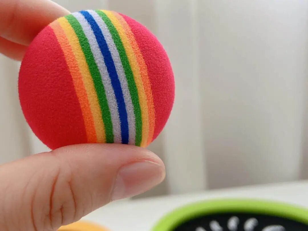 用的是高弹力彩球,弹射够轻、够快,落地也没什么声响。有点「静音球」的意思,在家玩也不会吵到。
