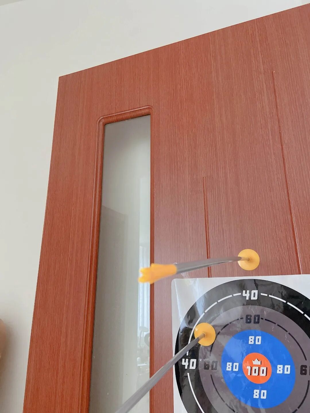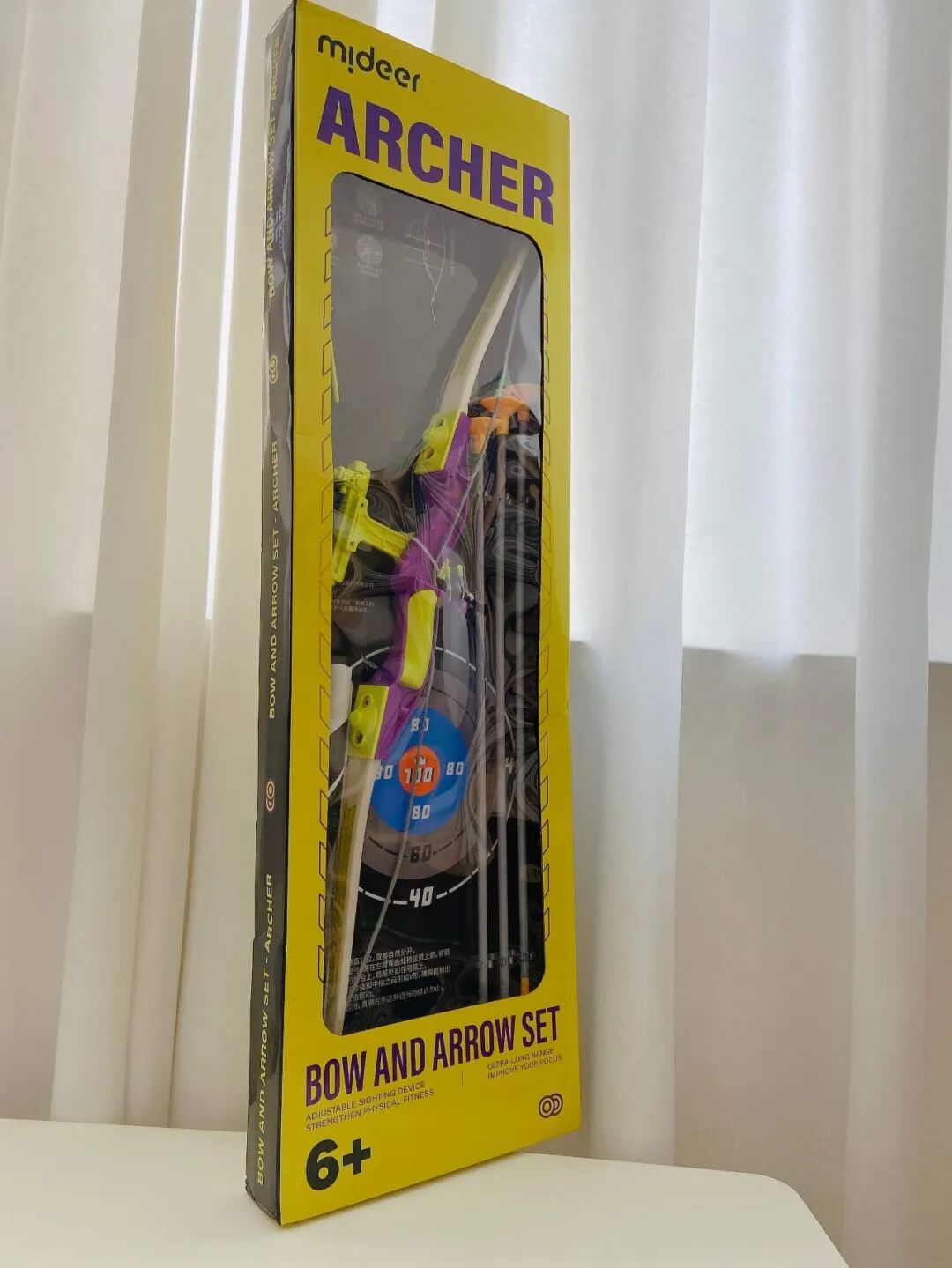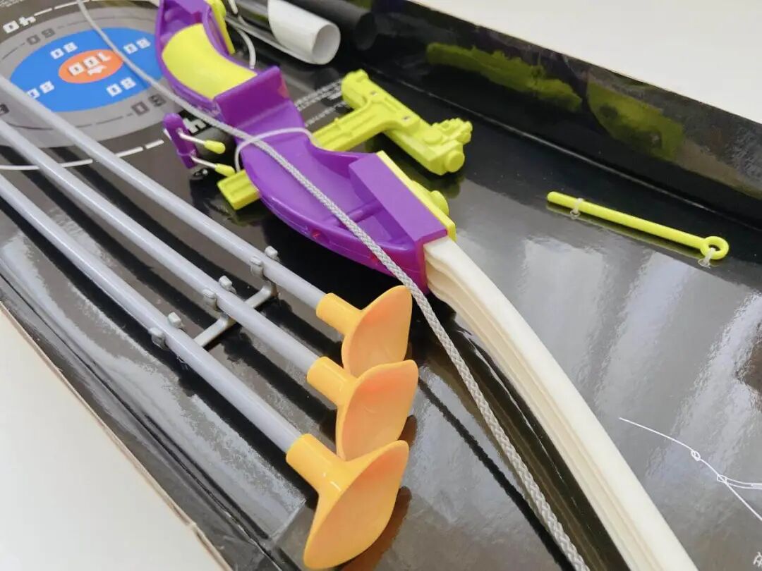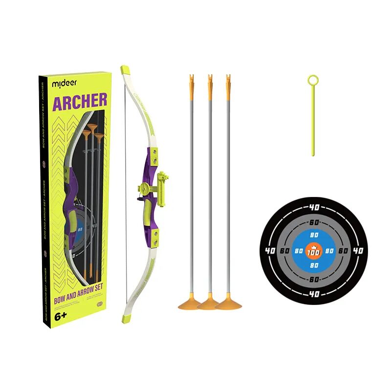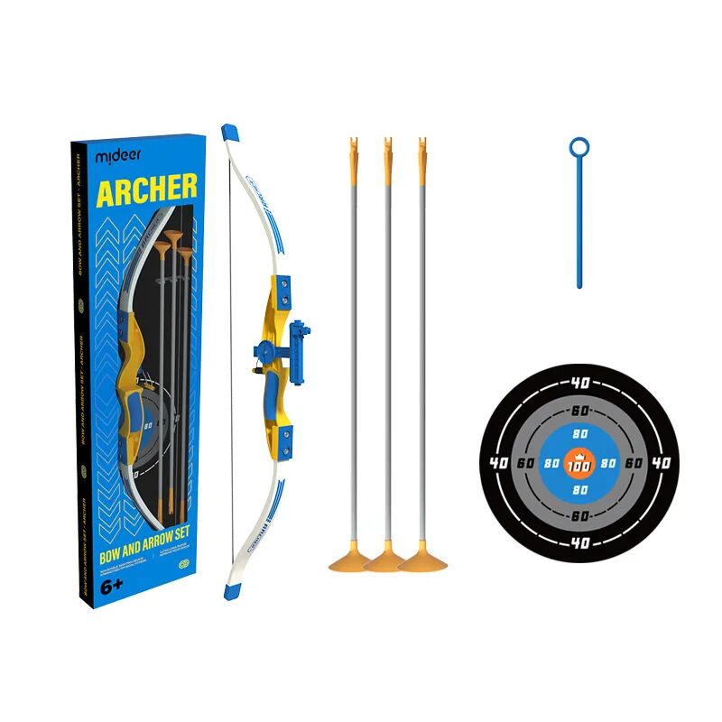 这款 mideer 吸盘弓箭套装,3 支吸盘箭、一个玩具弓、一个贴纸靶,室内、室外都可以玩。