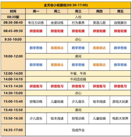 这类班大家估计都有所耳闻,课程表排的非常满,从早上 8:30 到下午 17:00,和小学作息别无二致,什么拼音、识字、数学、控笔、单词👇