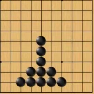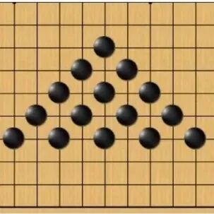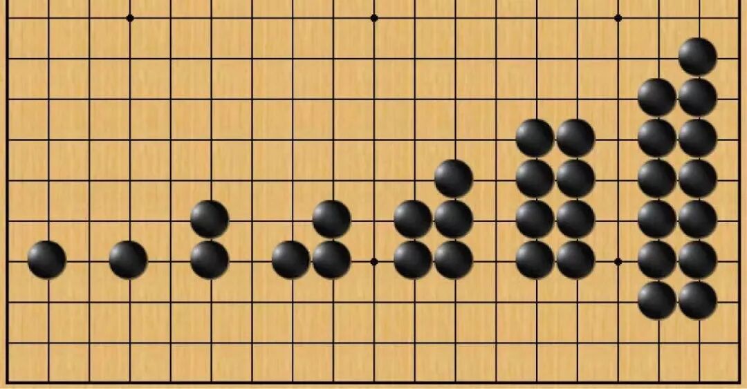 现在我们应该可以感受到,围棋与空间图形和数列的关系非常密切,更是有一个大自然中常见的有趣数列,能在棋盘上摆出来,它从左到右的围棋子的颗数是:1、1、2、3、5、8、13……