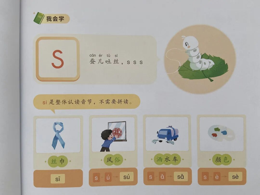 这些需要放在一起去比较,让孩子自己发现它们在字形上的不同和读音上的不同,同时借助一些孩子能理解的例子,强化区分,比如用刺猬和蚕吐丝来区分 s 和 c。