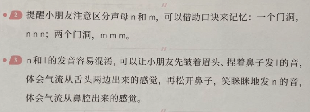 所以也不要着急,让孩子多试几次,找找感觉。我们可以让孩子摸着鼻子去读,感受读 n 时,鼻子的震动感;读 l 时,用舌头顶住门牙后面,把音弹出来。