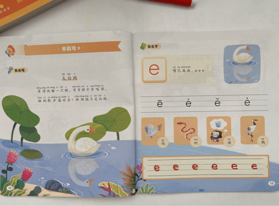 把它跟小朋友们都熟悉的诗歌《咏鹅》放在一个画面里,自然就容易读出来/e/了👇