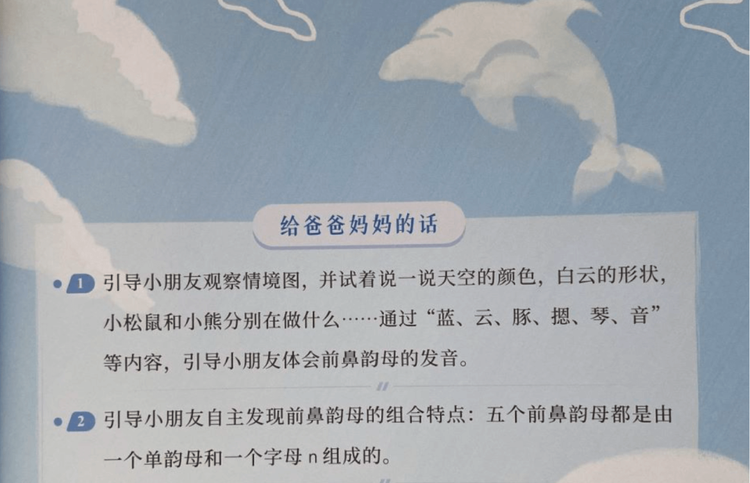 再比如,出门在外,可以引导宝宝抬头看蓝天白云,说一说天空的颜色,白云的形状,是不是像小海豚……通过“蓝、云、豚”引导孩子体会前鼻韵母的发音👇