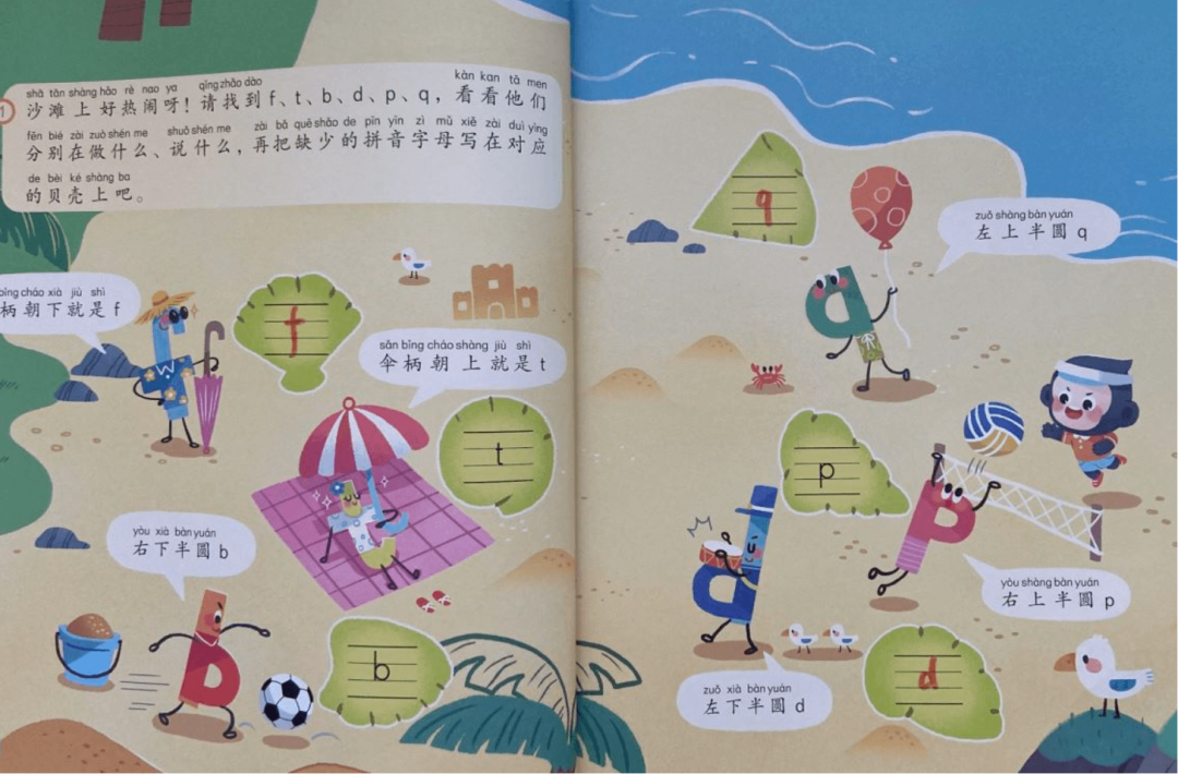 就萌医生自己来说,其实一开始不会让孩子在格子里写,而是会引导小团子自发进行前书写活动,比如参照着绘本,自己把声母、韵母画出来,然后拼到一起,看看还能不能读出来,就像在认拼音字母的阶段一样,尽量有趣一些👇