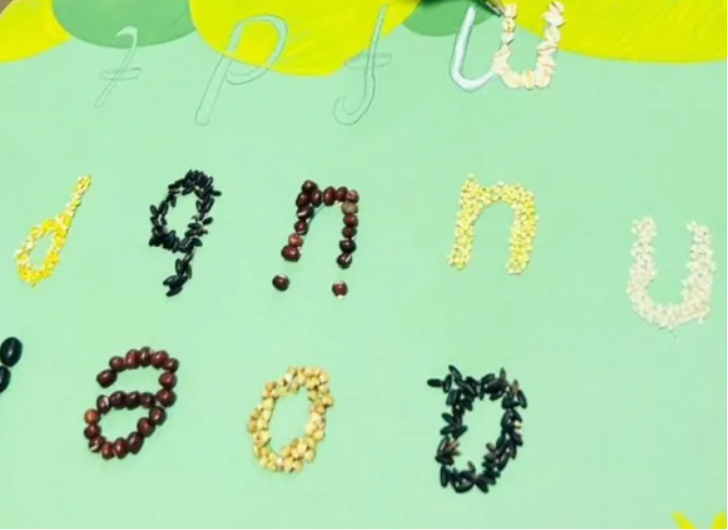 比如用彩泥捏拼音字母、把拼音画出来、用积木拼拼音字母、把拼音字母剪出来,甚至小圆子还用各种各样的豆子摆字母👇