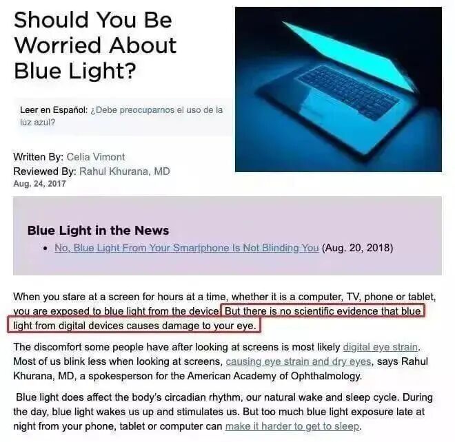 那些你日常最担心的诸如电子屏幕和电视机,尤其是他们所发出的蓝光、坐姿这些,和近视的关系并不那么密切,美国眼科协会 AAO 明确指出过:没有任何科学证据表明,手机、平板、电脑等设备发出的蓝光及其他因素会对眼睛造成伤害。