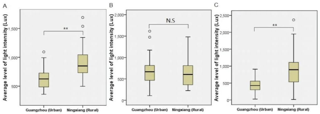 💡再看第二组数据,更糟糕——在城市生活和读书的孩子,在校期间平均环境光照度可以达到 620 lux,而周末在家期间的平均光照度竟然只有 390 lux(这个没得洗,高层住宅的采光一塌糊涂,和咱们小时候住的带院子的房子,根本没法比)!