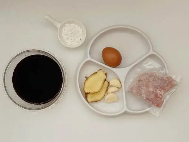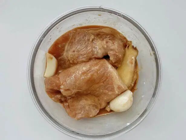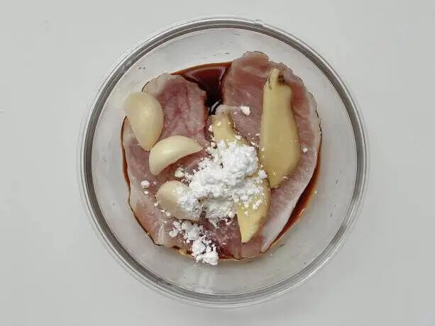 3.放1 勺酱油、1 勺素蚝油、1 大勺淀粉、姜蒜片抓匀,腌制 15 min