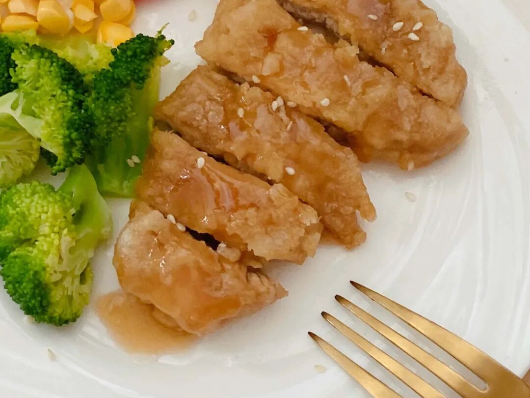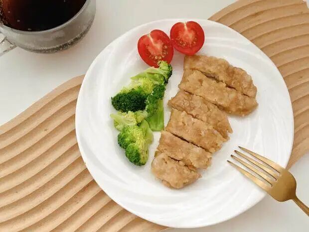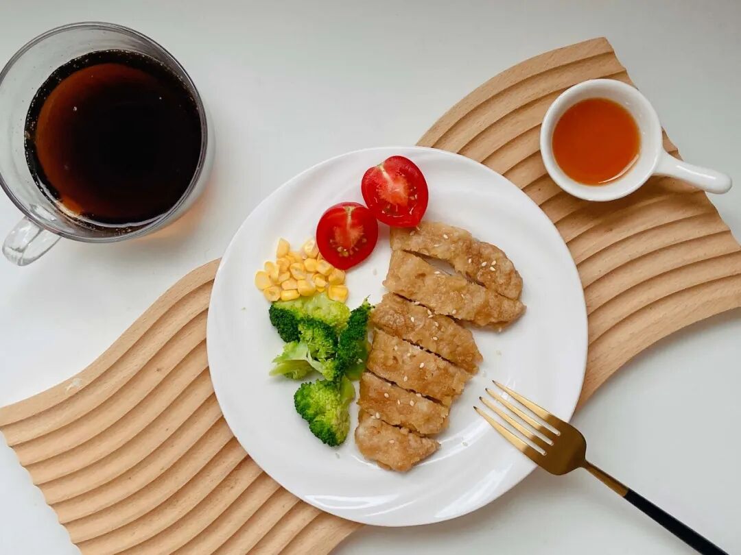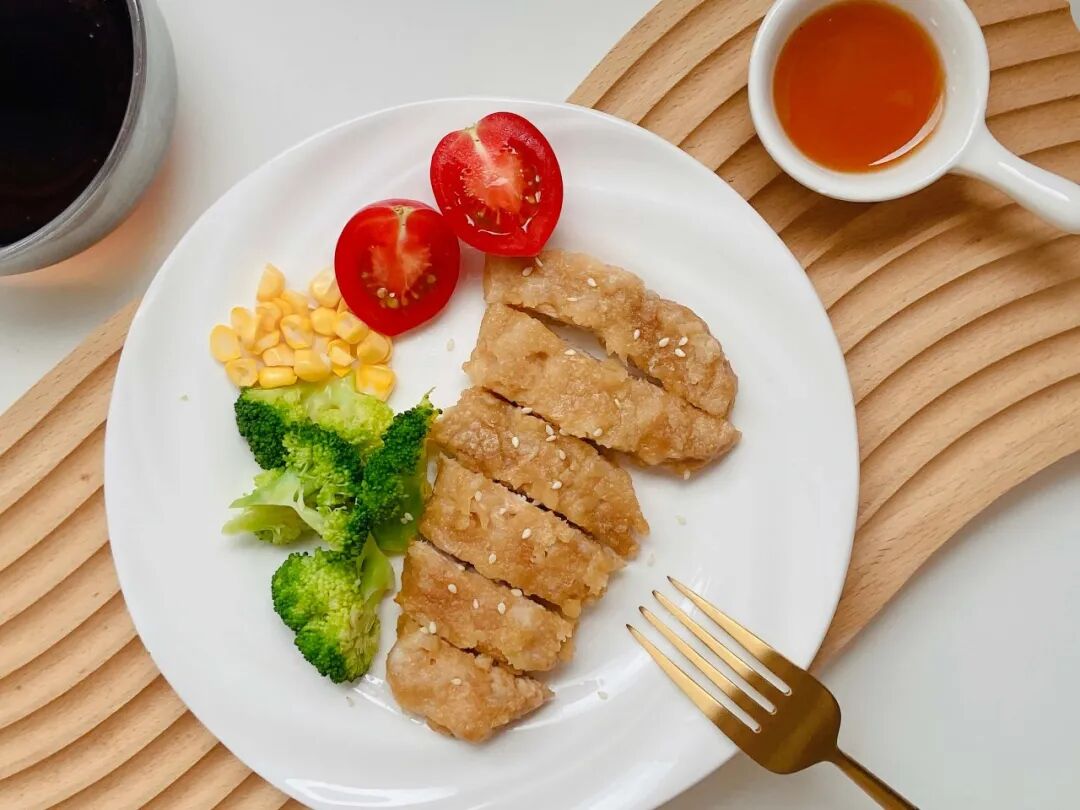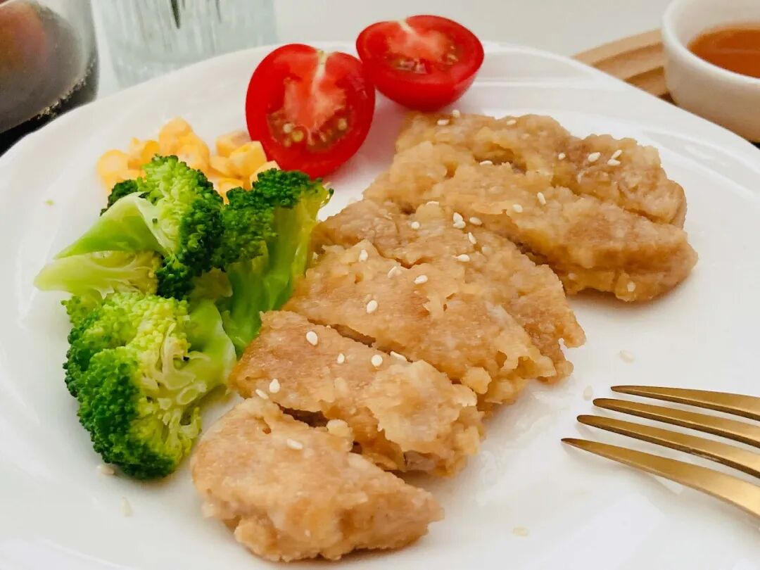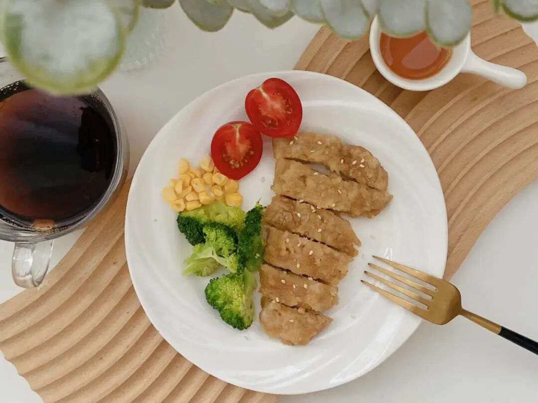 时蔬烤鸡胸肉也是嘎嘎香,两面刷油,空气炸锅烤上 6、7 分钟。想吃嫩一点,可以直接水煎。
