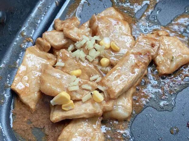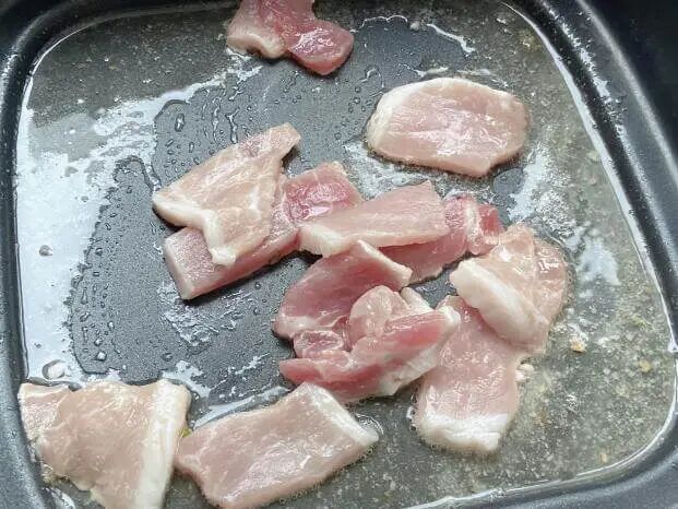 3.中火放入姜末和猪肉片炒至 7 成熟