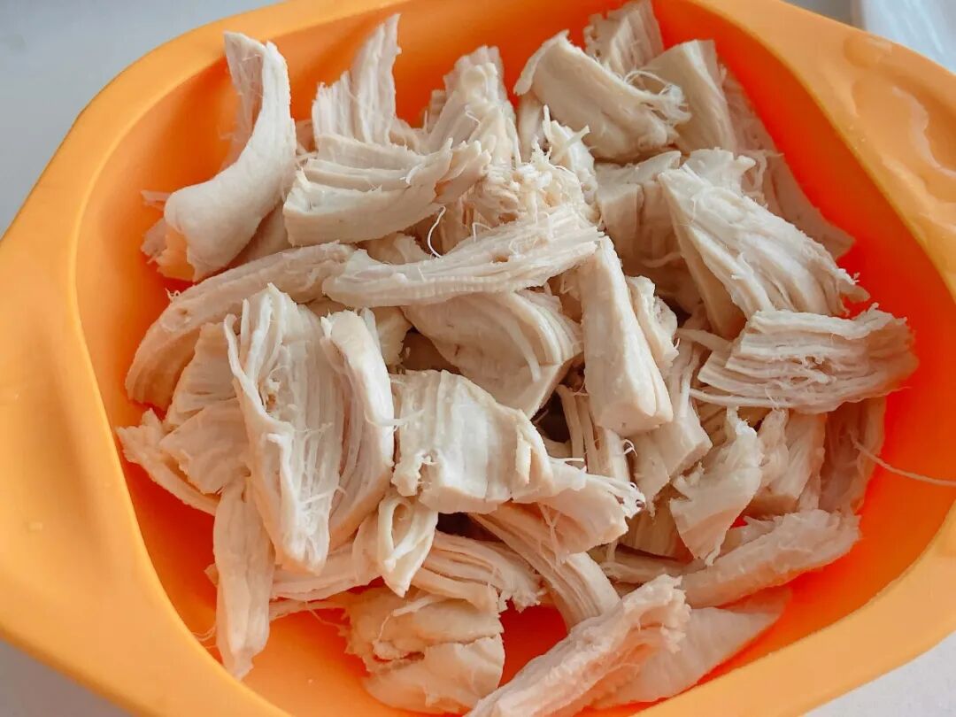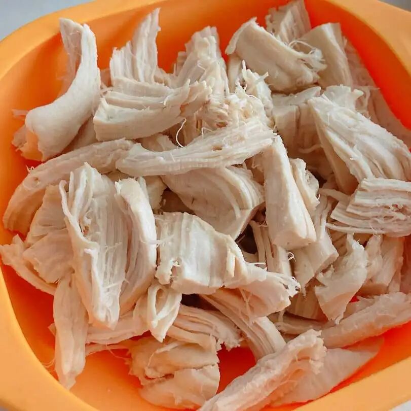 2.蒸煮炖烂、手撕鸡胸,放姜蒜