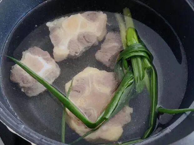 1.牛尾骨化冻,加生姜片焯水