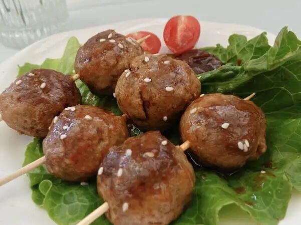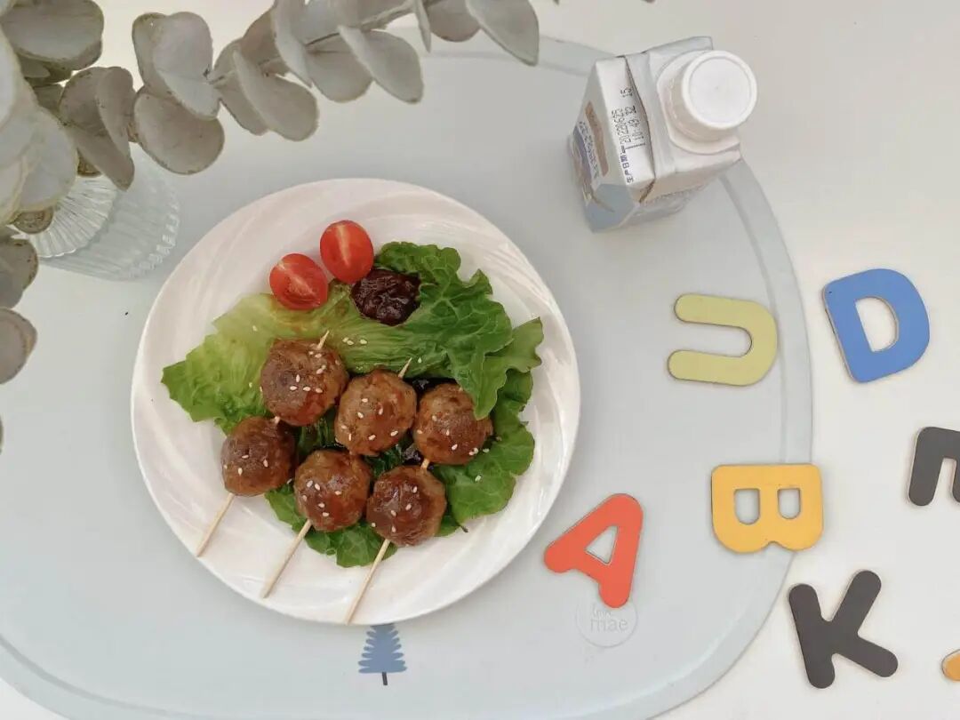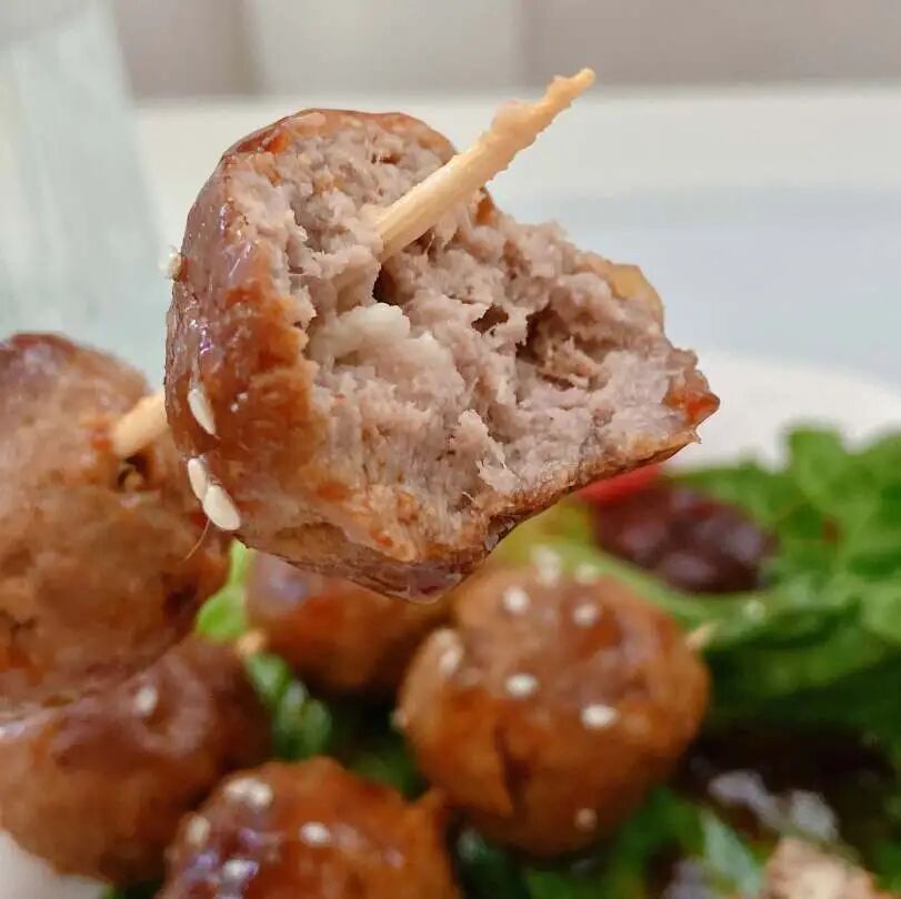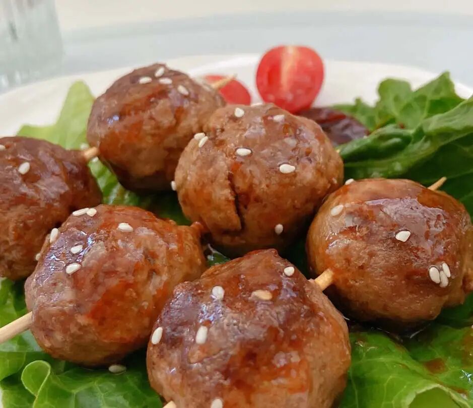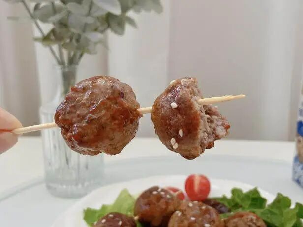 推荐下面这个照烧牛肉丸子(小圆子一顿能干 4、5 串,生怕她吃多撑了😂)。
