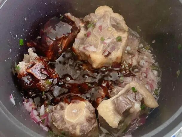 4.转中火下牛尾骨香煎,转大火倒入酱汁翻炒