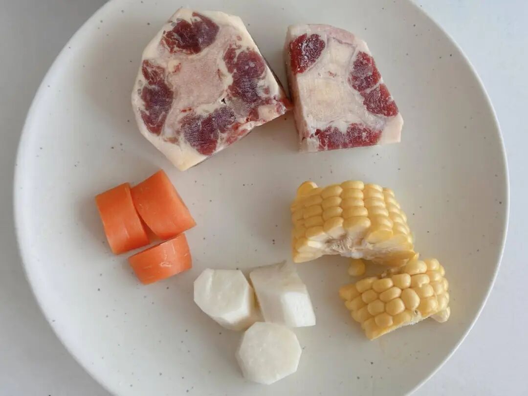 1.牛尾骨化冻,加入葱姜料酒焯水,蔬菜切丁切块备用