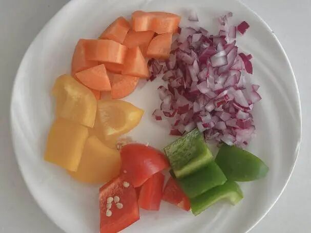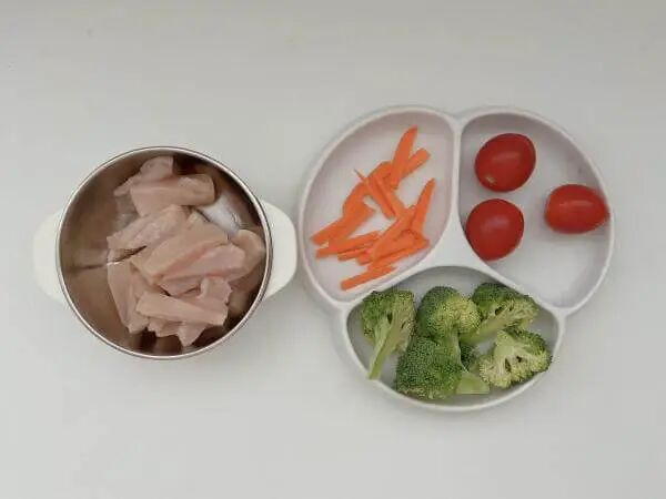 1.鸡胸肉化冻切成条状,蔬菜焯水备用