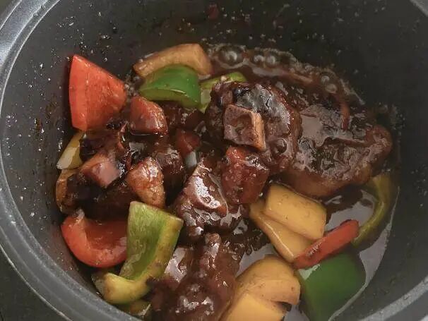 4.加酱汁翻炒,盖上锅盖闷 8 min,收汁后出锅