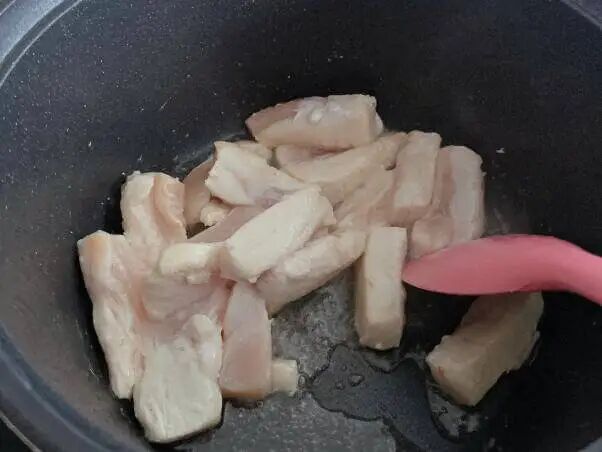 2.鸡胸肉热油下锅炒制半熟
