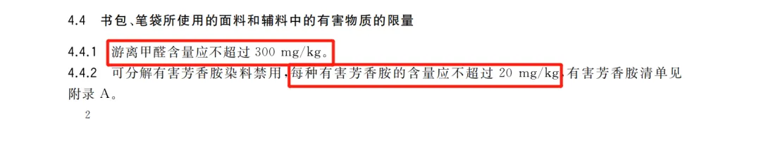 因此,根据国家标准GB21027—2020《学生用品的安全通用要求》:在书包使用的面料和辅料中,游离甲醛的含量不能超过300mg/kg,每种有害芳香胺的含量不能超过 20mg/kg👇