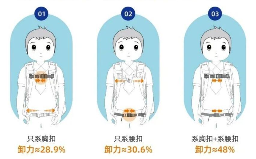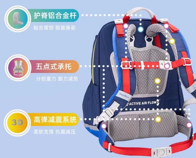 △五点式承托式设计,扣上胸扣和腰扣后护脊书包可有效减轻肩部压力达 48%