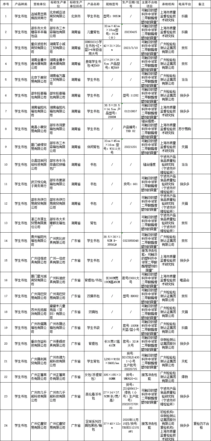 近期,市场监管总局在 14 家平台 83 家销售单位抽查了 84 批次学生书包,涉及广东、湖南、北京等 5 个省份 80 家生产单位,抽查发现 24 批次产品不合格。