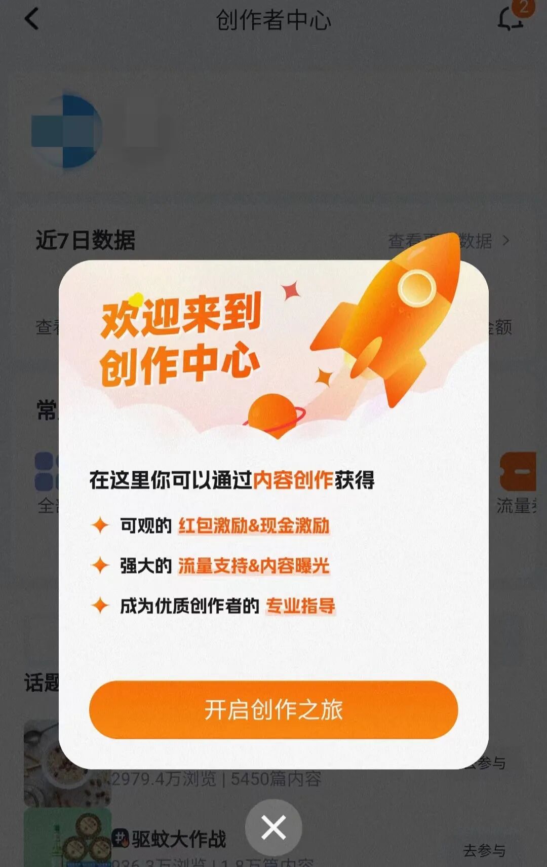 打开某宝,点下面的“视频”选项,进入后点左上角的三条杠,进入个人主页,点“创作中心”,新用户会有一个欢迎页面,点“开启创作之旅”,进入创作者服务。