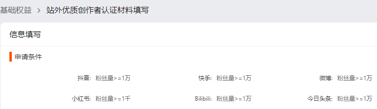 如果你在其他平台,抖音,快手,B站,微博,今日头条任一平台达到10000粉,小红薯平台达到1000粉就可以申请认证。