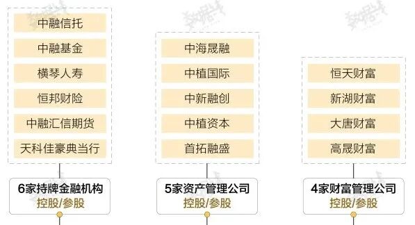 其金融板块拥有6家持牌机构,涉及信托、基金、期货、财险等,5家资管公司负责倒卖资产,4家财富公司负责敛财。