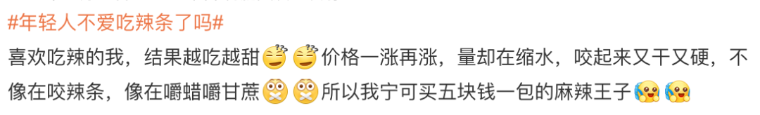 微博“年轻人不爱吃辣条了吗”的话题登上热搜。总结评论区的发言,年轻人并不是不爱吃辣条了,而是不接受“越来越贵的价格和退步的味道”,市面上越来越多的选择,也让年轻人不再只钟情于卫龙。