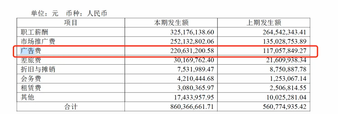 2023年,其销售费用高达8.6亿元,同比增长53.42%。单就广告费一项就花出去2.21亿元,快赶上利润了,增长高达88.48%。