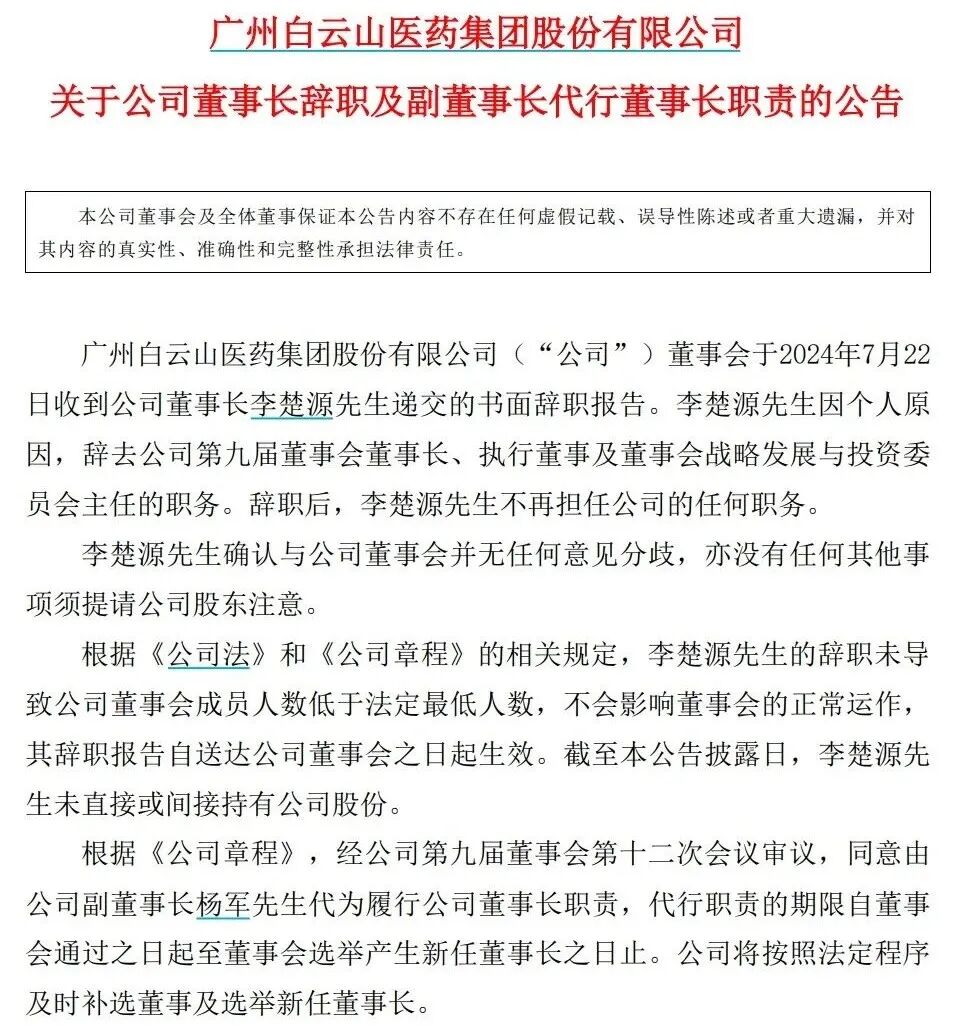 7月22日,华南医药龙头广药集团子公司白云山发布公告:董事长李楚源因个人原因辞去公司董事长等职务,广药集团一号人物结束长达11年的掌权之旅。