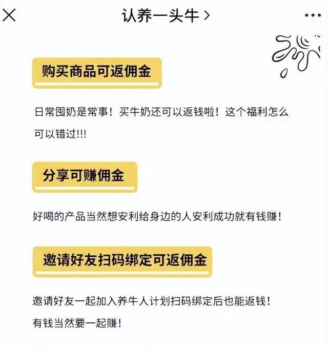 另外认养一头牛2020年推出的“养牛人招募计划”也被诟病已久,一系列“购买商品可返佣金”“分享可赚佣金”“邀请好友扫码绑定可返佣金”等活动,堪比拼多多,被部分消费者吐槽是“微商式卖奶”。