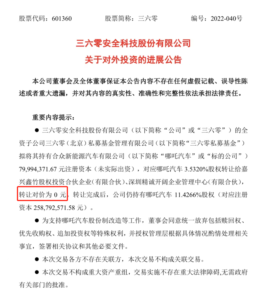 6月26日晚间,三六零发布公告称,其全资子公司三六零私募基金拟将其持有的对应哪吒汽车3.53%股权的出资权转让给两家有限合伙企业,转让价格为0元。