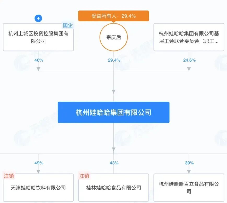 工商资料显示,娃哈哈集团大股东是杭州上城区文商旅投资控股集团有限公司,持股46%;宗庆后持股29.4%;娃哈哈集团职工持股24.6%。