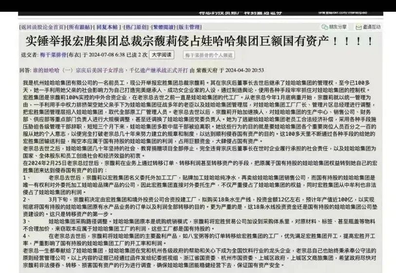 除了宗馥莉辞职公告外,此前还有一份“宏胜集团总裁宗馥莉侵占娃哈哈集团巨额国有资产”的举报信在网上流传。