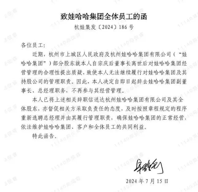 一封宗馥莉措辞严厉的辞职信在网上流传开来,签署时间为2024年7月15日。
