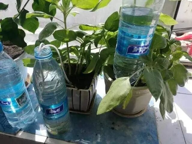 攒一些带瓶盖的矿泉水瓶,在上面开一个直径2毫米左右的小孔,把它倒着埋在花盆里,当盆土比较干的时候,花盆内压力变小,矿泉水里的水就会自动流到花盆里,这样就不会渴着花草了,解决了咱们的燃眉之急。