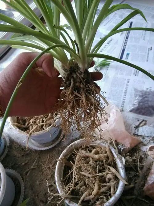 先给吊兰脱盆,把根系上的土都清除干净,检查根系,把老化的、干瘪的、腐烂的根系都修剪的,如果根系还是比较多的话,可以再修剪掉一部分,留下1/4的根系即可。修剪完根系后,别急着上盆,放在阴凉的地方晾2—3天,看到伤口干瘪了,再用新的土壤上盆即可。