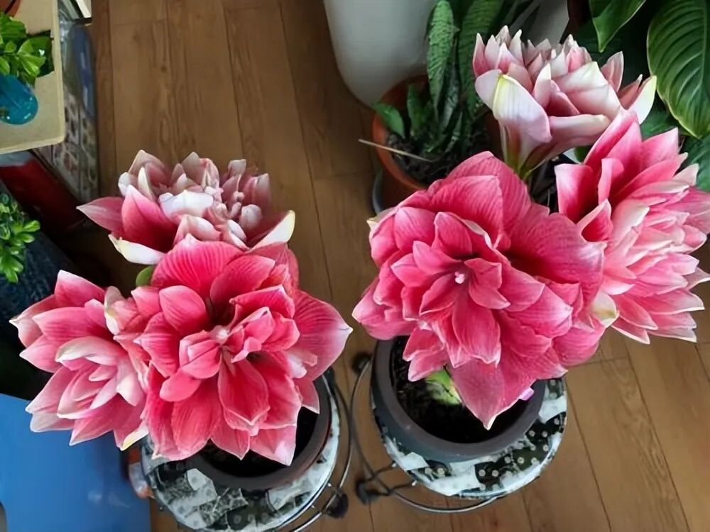 朱顶红是球根花,只要养过朱顶红的人,都知道,不能用大盆,大盆在浇水上极难控制,一不小心就会烂根,烂球,所以最好用一个小一些透气性好的陶盆来栽种,只埋入球体的三分之一,一般春天栽种,多晒太阳,浇水见干见湿,有上2个月就能开出漂亮的花朵。