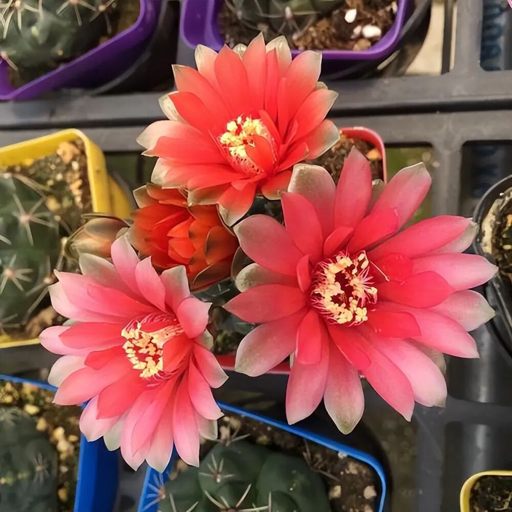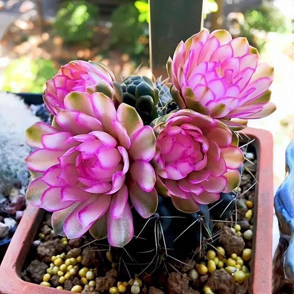 绯花玉是仙人掌类的多肉植物,不开花的时候,看着就像一个仙人球,它的盛花期在夏季,不过其它季节也能开花,养护得当,能从5月初开以12月份,花色很多,以粉、白、黄、红为主,花生于顶端,一开就爆盆,球形端庄,开花极美丽,放在窗台、阳台或是庭院里,很漂亮,开花频率很高,被很多花友称为“开花机器”。